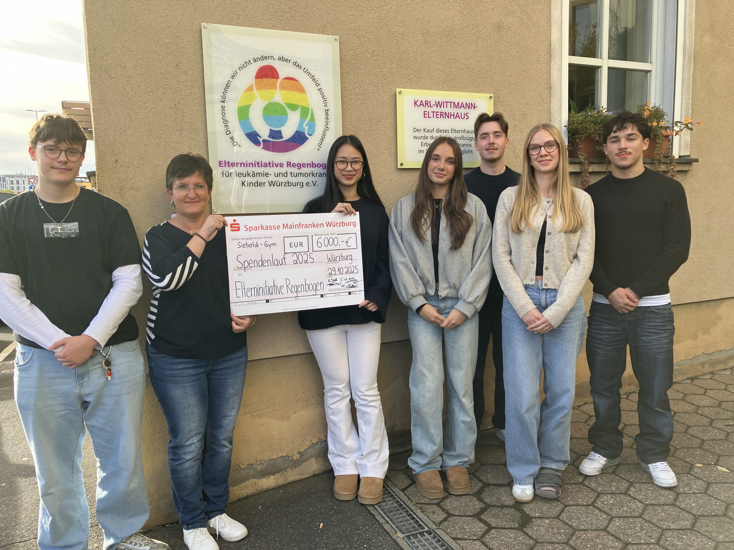Zumindest einen kleinen Lichtblick konnte das Team der SMV, der Fachschaft Sport sowie der Verbindungslehrkräfte des Siebold-Gymnasiums den ehrenamtlichen Helferinnen und Helfern des eingetragenen Vereins verschaffen, als die Schülersprecherinnen und Schülersprecher den Mitarbeiterinnen Frau Lampert und Frau Kempa einen symbolischen Scheck über einen Betrag in Höhe von 6.000 € überreichten. Eine Summe, die nur durch den eifrigen Einsatz unserer Schülerinnen und Schülern der Unterstufe beim Spendenlauf am Schuljahresende 2025/26 zusammenkam. Unser Dank richtet sich besonders auch an die Eltern, die großzügige Geldbeträge auf den Laufzettel eintrugen, die sie bereit waren, pro erlaufenen Kilometer zu zahlen!