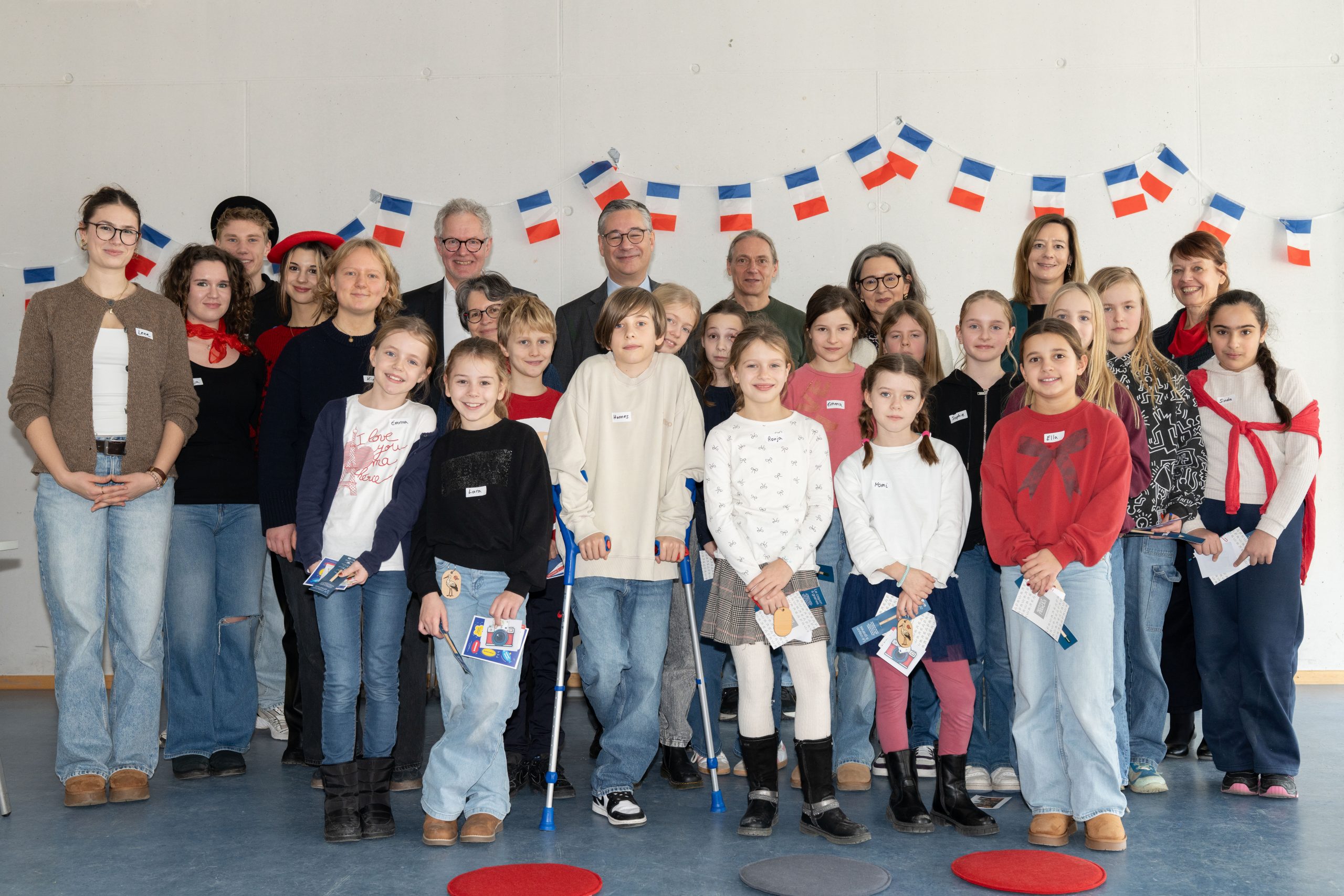 Mit einem fröhlichen „Salut, ça va ?“ hieß die Klasse ihre Gäste willkommen. Der Generalkonsul richtete anschließend eine sehr persönliche, ermutigende Ansprache an die Kinder. Danach ging es – passend zum Lehrwerk – auf eine kleine „Reise“ zum Straßburger Weihnachtsmarkt: Die Schülerinnen und Schüler erkundeten liebevoll gestaltete Stände mit Crêpes, Souvenirs und Postkarten und konnten dabei ihre ersten Sprachkenntnisse spielerisch ausprobieren.