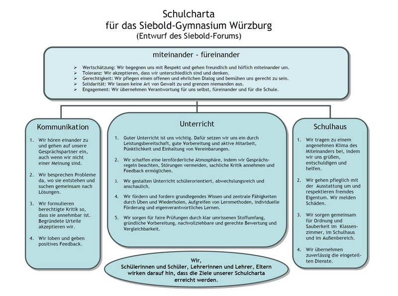 Das Siebold-Forum, dem Schülerinnen und Schüler, Eltern und Lehrkräfte angehören, hat im Laufe diesen Schuljahres eine übersichtliche Schulcharta für unser Gymnasium erarbeitet, die wir hiermit vorstellen möchten: Download Schulcharta